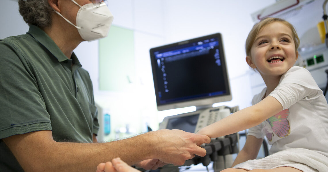 Die Diagnose einer rheumatischen Erkrankung und ihre Einordnung in die verschiedenen Erscheinungsformen ist nicht immer einfach. Umso wichtiger ist eine ausführliche Anamnese gefolgt von einer gründlichen körperlichen Untersuchung mit Erhebung eines kompletten Gelenkstatus. Gerade bei ängstlichen und sich wehrenden Kindern ist dies oft herausfordernd. Fast immer schließt sich eine Ultraschalluntersuchung der Gelenke an, in der wir zusätzliche Informationen zum Gelenkbefall und auch sehr diskrete Veränderungen an den Gelenken nachweisen können. In einzelnen Fällen benötigen wir eine Kernspintomographie bestimmter Gelenke, insbesondere bei Beteiligung der Halswirbelsäule, der Kiefergelenk oder bei älteren Kindern mit Kreuz-Darmbeingelenkentzündung, der sogenannten Sakroiliitis. Bei vielen Kindern muss zu Beginn eine Blutuntersuchung erfolgen. Sie kann weitere Indizien zur Diagnose liefern und andere Erkrankungen, sogenannte Differentialdiagnosen, ausschließen. Alle Kinder mit rheumatischen Gelenkerkrankungen müssen kurzfristig augenärztlich vorgestellt werden, um eine gefährliche chronische Regenbogenhautentzündung auszuschließen oder nachzuweisen.
