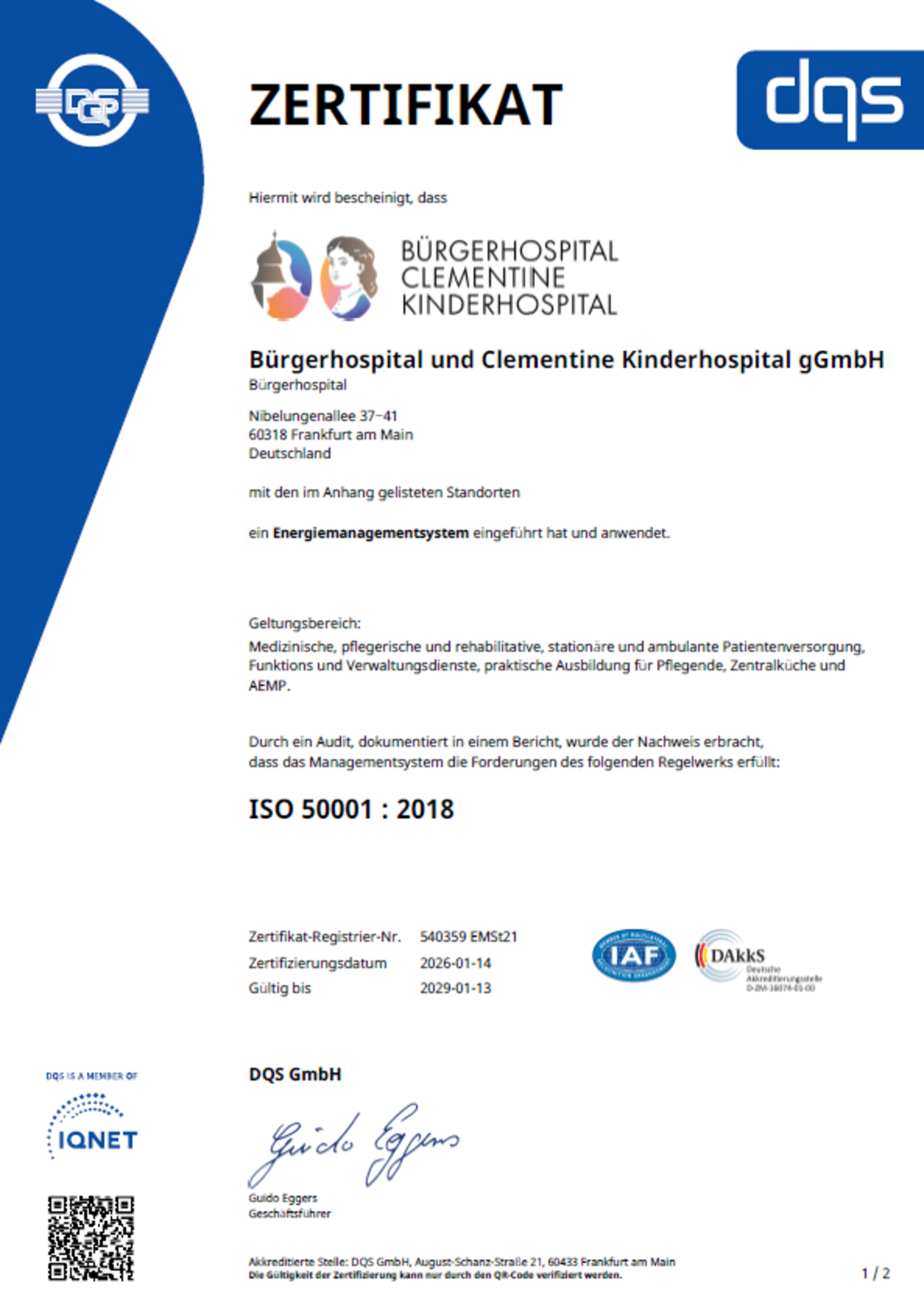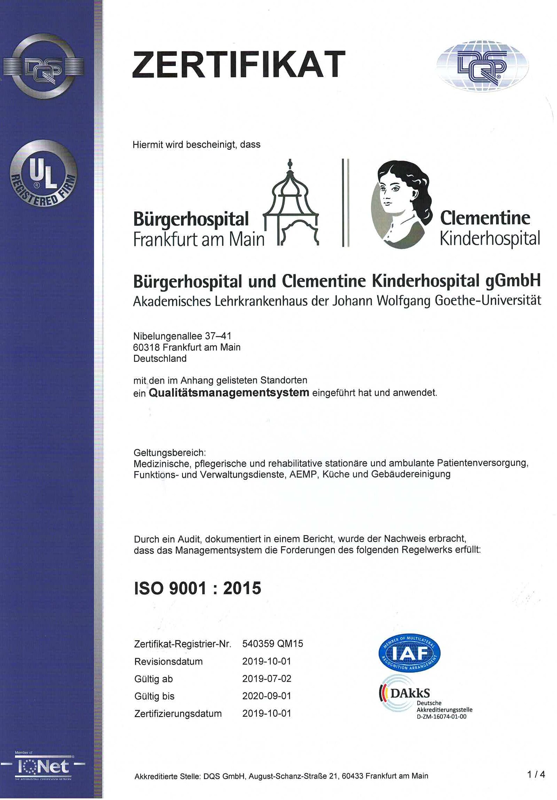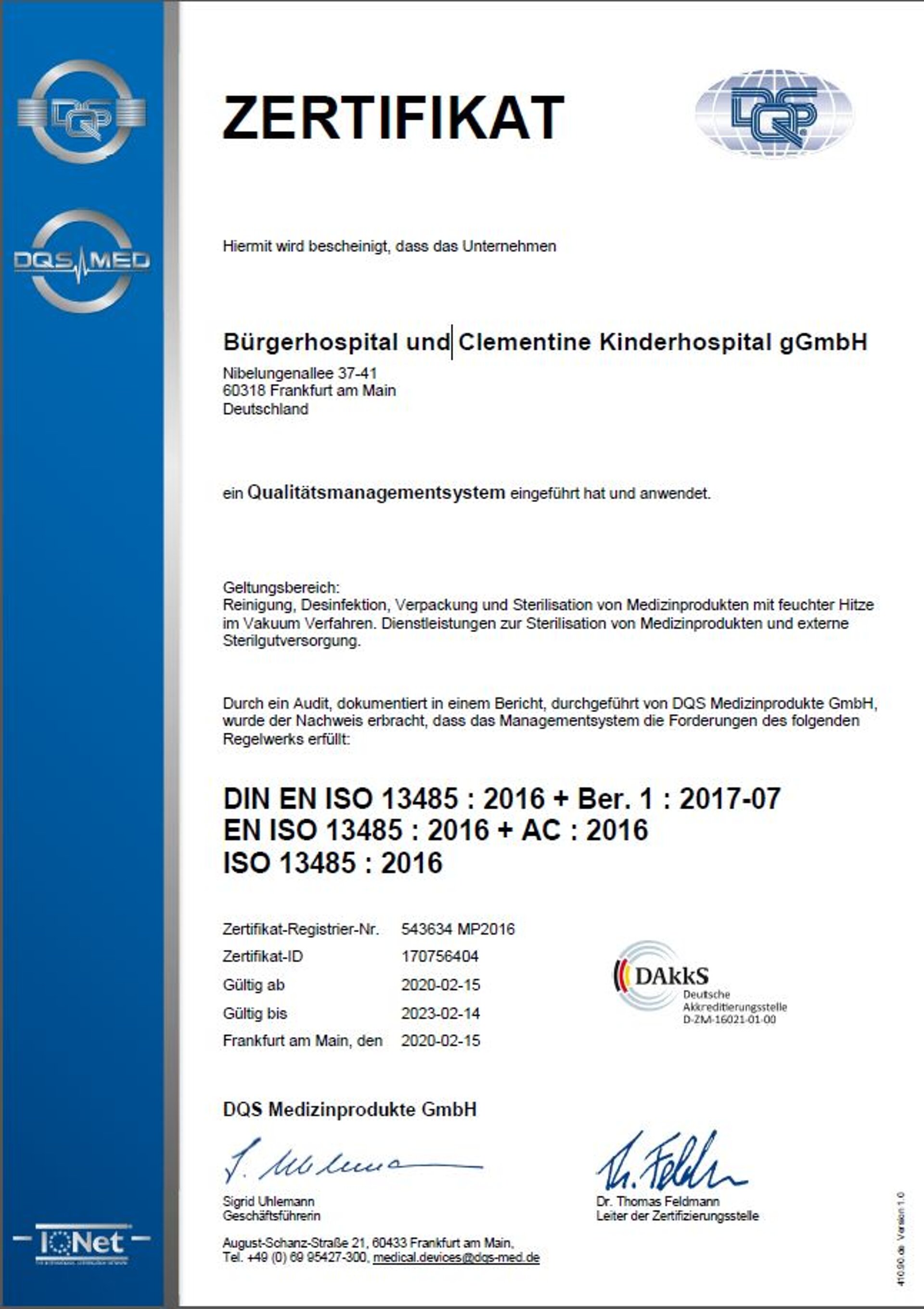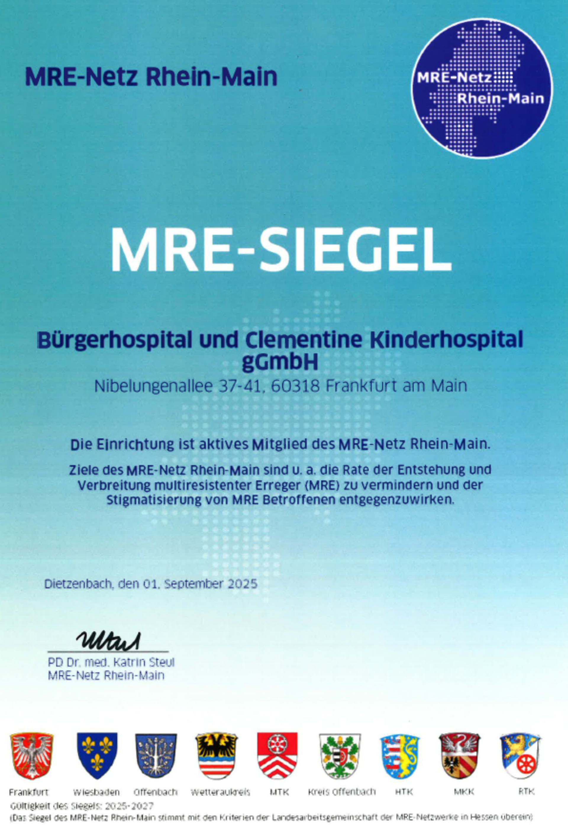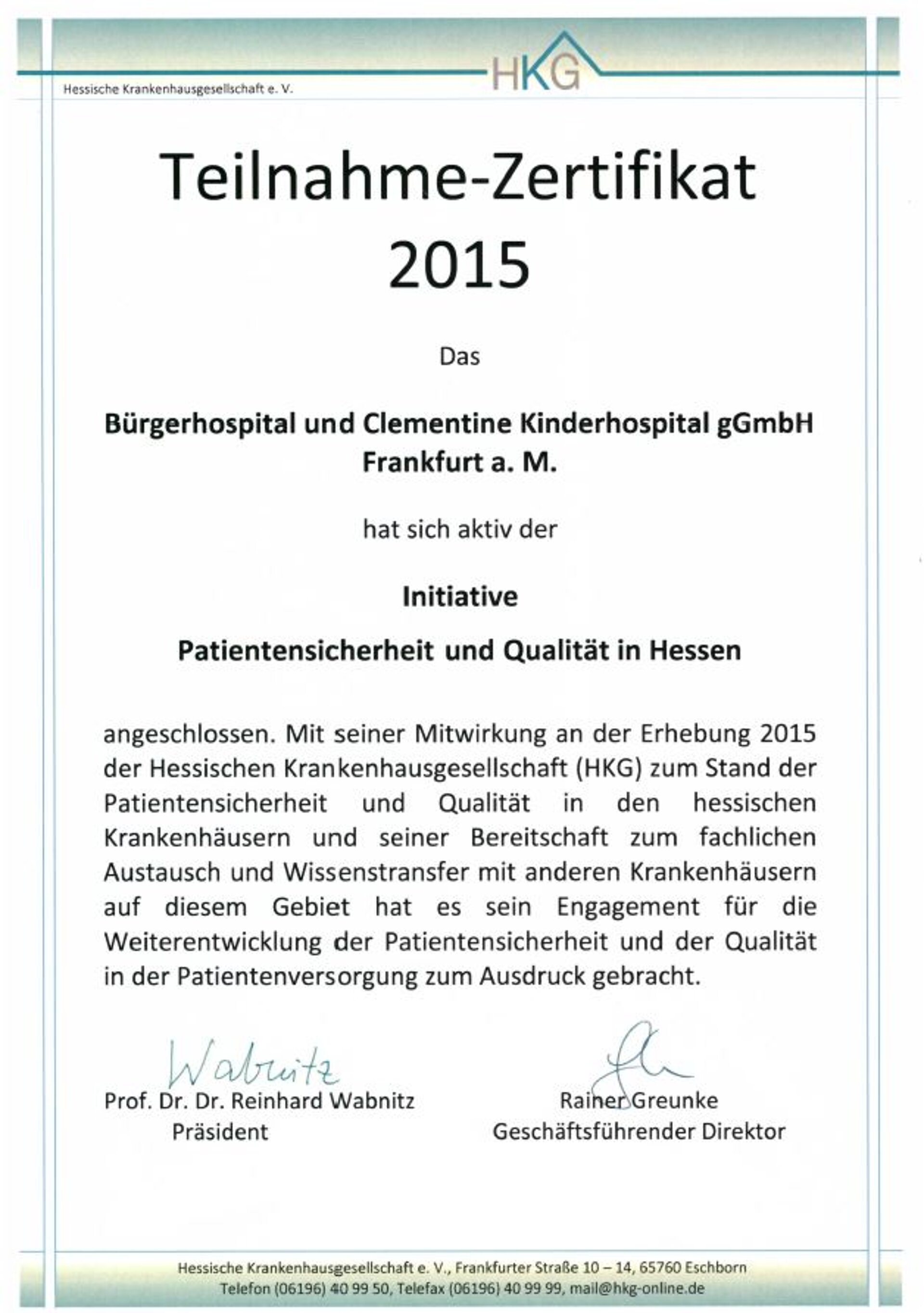 Unsere Ergebnisqualität und die Wirksamkeit unseres Qualitäts-managementsystems lassen wir uns jährlich durch externe Expert:innen bestätigen. Daher ist die Bürgerhospital und Clementine Kinderhospital gGmbH schon seit mehreren Jahren nach der DIN EN ISO 9001 zertifiziert. Die Ergebnisqualität unserer Schwerpunktbereiche wie z. B. das Weaning-Zentrum, das Traumazentrum sowie die Diabetologie lassen wir uns zusätzlich von den entsprechenden Fachgesellschaften bestätigen und zertifizieren.