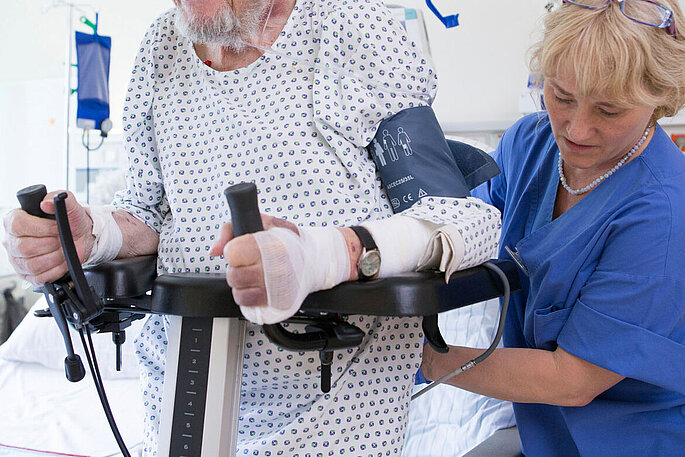 Das logopädische Tätigkeitsfeld überschneidet sich in sehr vielen Dingen mit dem der Atmungstherapeutinnen - auch hier ist der „interdisziplinäre Geist“ der Abteilung deutlich zu spüren, Hand in Hand wird das Fachwissen angewendet. Auch die Tätigkeitsfelder der Physiotherapeutinnen mit der Zusatzausbildung „Atemphysiotherapie“ ergänzen sich mit denen der Kolleginnen. Barbara Früh, die „Atemphysiotherapeutin“, behandelt nach speziellen Leitlinien. Je nach Vigilanz (Wachheitszustand) des Patienten wird die Therapie angewendet. Tief sediert und ggf. beatmet, wird er passiv behandelt, d. h. Arme und Beine werden durchbewegt, muskuläre Techniken angewendet, Bewegungsabläufe angebahnt, der Brustkorb durch Drucktechniken komprimiert. Je wacher der Patient ist, desto mehr wird er in die Therapie einbezogen bis hin zum eigenständigen Bewegen der Extremitäten, zum Gehen und dem Angebot des Ergometertrainings („Motomed“) der Arme und Beine. Physio- und Atmungstherapeutin behandeln zusammen durch Anwendung verschiedener Atem- und Lagerungstechniken - wiederum in erster Linie zur Förderung der Sekretion und durch Unterstützung und Anleitung zur Kontraktion der Bauchmuskulatur, um den Hustenstoß auszulösen.