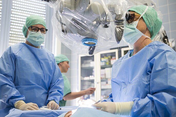 Je nach Schweregrad der Entzündung kann die Endokrine Orbitopathie konservativ, z. B. mit der Gabe von Kortison, behandelt werden. Bei schweren Krankheitsverläufen muss jedoch eine sogenannte Entlastungsoperation vorgenommen werden. Dies ist dann der Fall, wenn das entzündete Gewebe vernarbt und verfettet ist. Bei der Entlastungsoperation entfernen Prof. Pitz und ihr Team betroffenes Gewebe und Knochenteile, die nicht für die Statik des Schädels relevant sind. Dadurch schaffen sie in der Augenhöhle wieder Raum für das Auge. Die Operation erfolgt über einen minimalinvasiven Schnitt in der Bindehaut, sodass keine sichtbaren Narben zurückbleiben. „Früher wurden solche Operationen nur dann durchgeführt, wenn z. B. aufgrund des hohen Drucks auf den Sehnerv eine Erblindung oder eine Schädigung der Hornhaut drohte“, so Prof. Pitz. „Zum Glück hat man mittlerweile auch die enorme psychische Auswirkung auf den Betroffenen erkannt, sodass wir heute nicht nur in Notfallsituationen operieren.“