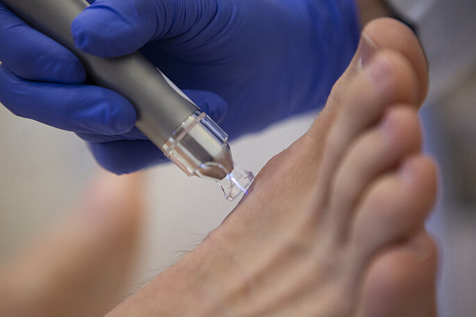 Und tatsächlich kann der Fuß durch ein geduldiges und überlegtes Vorgehen häufig erhalten werden. Denn auch hier stehen eine Vielzahl an Behandlungsmöglichkeiten zur Verfügung, die in enger Zusammenarbeit mit chirurgischen, gefäßchirurgischen und angiologischen Kolleg:innen erörtert werden. Beispielsweise kann die Durchblutung der Beine durch eine Aufweitung der Arterien verbessert werden, was wiederum die Wundheilung beschleunigt oder überhaupt erst ermöglicht. „Wir wenden aber auch innovative Therapien wie wassergefilterte Infrarot-A-Bestrahlung oder das sogenannte ‚Kalt-Plasma‘ an. Dabei wird die Wunde mit einem hoch-energetisch ionisierten Gas behandelt. Dieses tötet Bakterien ab und regt die Neubildung von Hautzellen an“, erläutert Dr. Klug.