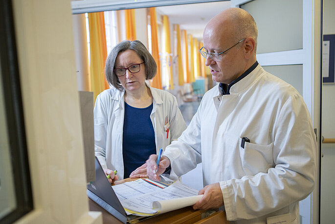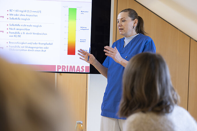 Dafür ist die Diabetologie am Bürgerhospital breit aufgestellt: Hier arbeiten Fachärzt:innen, Diabetesberater:innen, speziell geschultes Pflegepersonal sowie zertifizierte Diabetes- und Diätassistent:innen und Wundexpert:innen eng zusammen. Auch eine Psychologin arbeitet in der Diabetologie. „Manche Patienten verwundert das erstmal. Aber das Ziel ist ja nicht nur eine Behandlung während des Aufenthaltes bei uns, sondern wir wollen auch passende Therapie- und Weiterbehandlungsoptionen für den Lebensalltag entwickeln. Und hierfür ist es wichtig, die individuelle Lebenssituation und mögliche psychische Belastungen zu kennen“, meint Diplom-Psychologin Kathrin Sedelmeier. Dafür werden auch Einzelgespräche angeboten. Darüber hinaus gibt es strukturierte und moderierte Schulungen, in denen Strategien zum Motivationsaufbau und zum Umgang mit diabetesspezifischen Problemen vermittelt werden. „Viel wichtiger ist aber oft, dass die Betroffenen die Möglichkeit haben, sich über ihre Empfindungen und Erfahrungen mit Diabetes untereinander auszutauschen“, ergänzt Sedelmeier.
