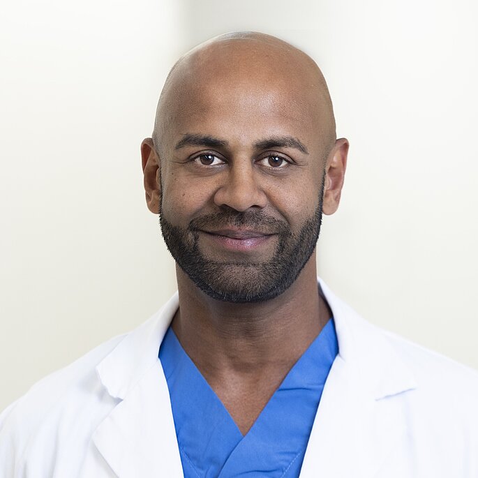 Dr. med. Arun Kumarasamy widmet sich seit 2009 der Radiologie. Von 2011 bis 2016 war er als Funktionsoberarzt im Sana Klinikum Offenbach tätig und arbeitete parallel in der Praxis für Interventionsangiologie von Prof. Dr. med. Erhard Starck – einem Pionier kathetergestützter Gefäßbehandlungen. Seit dieser Zeit hat er sich kontinuierlich auf minimalinvasive Therapieverfahren spezialisiert. 2017 baute Dr. Kumarasamy die Abteilung für Interventionelle Radiologie am DGD Krankenhaus Sachsenhausen neu auf, die er zuletzt als Chefarzt leitete. Neben der medizinischen Ausbildung absolvierte er ein MBA-Studium für internationales Krankenhaus- und Gesundheitsmanagement an der Frankfurt School of Finance, das er mit Bestnote abschloss. Seit 1. Oktober 2025 ist Dr. Kumarasamy Chefarzt der neu gegründeten Klinik für Interventionelle Radiologie am Bürgerhospital.
