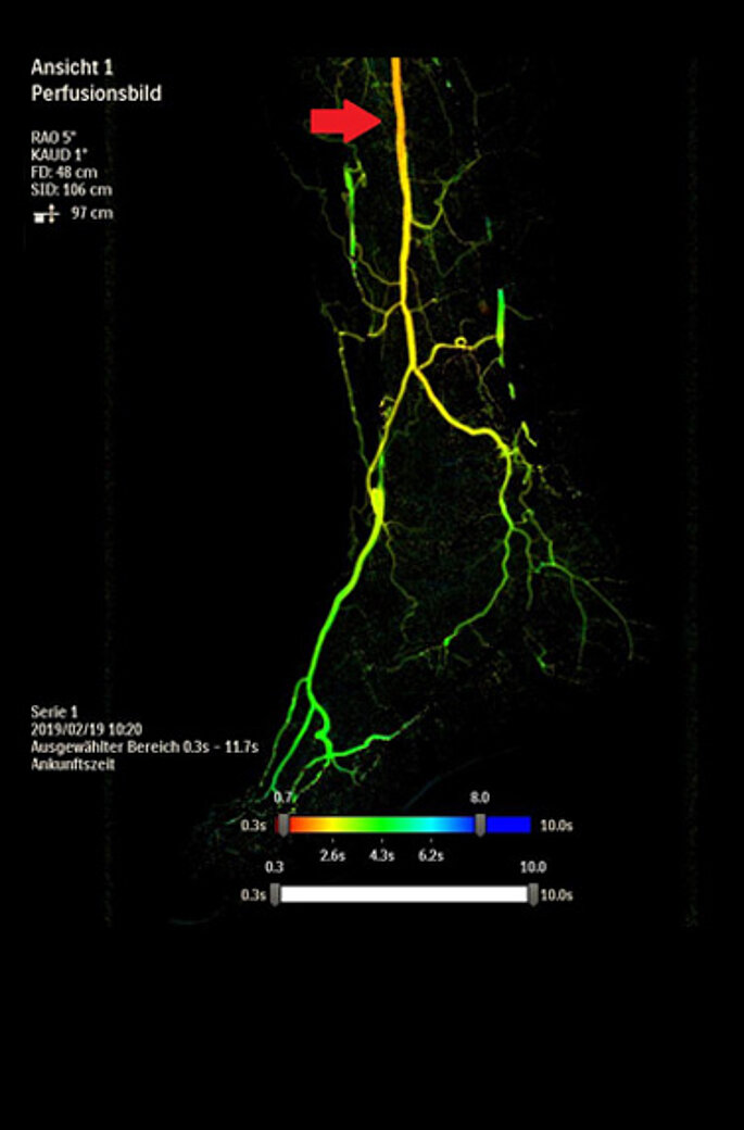 Zur Behandlung der Patient:innen kommen in der Klinik moderne Verfahren der interventionellen Gefäßmedizin zum Einsatz. Ein zentrales Verfahren ist die perkutane transluminale Angioplastie (PTA). Dabei wird ein verengtes oder verschlossenes Gefäß mithilfe eines feinen Ballonkatheters aufgedehnt. In seltenen Fällen wird zusätzlich ein Stent – ein feines Gefäßstützgerüst – implantiert, um die Durchgängigkeit dauerhaft zu sichern. Bei stark verkalkten Engstellen kommt eine spezialisierte Technik zum Einsatz: die Rotationsatherektomie. Dabei wird das verkalkte Material mit einer rotierenden Mikrofräse sanft abgetragen – ein Verfahren, das besonders bei langstreckigen oder komplexen pAVK-Verläufen gute Ergebnisse zeigt.