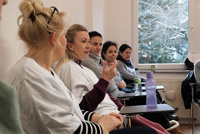 Während Ärztin und Pflegekräfte die Patientin versorgen, klatscht jemand in die Hände, gefolgt von einem „Szenario stopp!“. Dr. Maria Perez de Laborda hat das Geschehen rund um das Patientenbett im Hintergrund verfolgt. Die Frauenärztin verantwortet die Simulationstrainings der Frauenklinik und der geburtshilflichen Stationen. „Die Simulationstrainings sind fester Bestandteil in der Dienstplanung des Bereichs Geburtshilfe: Alle Pflegekräfte erhalten mindestens einmal jährlich ein ganztägiges Simulationstraining, die Ärztinnen und Ärzte zweimal im Jahr“, erklärt die Oberärztin.