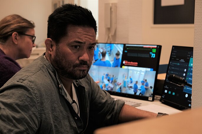Der dritte Raum dient dem „Debriefing“: Hier überträgt ein großer Bildschirm das Geschehen aus dem Demo-Raum, sodass auch Kolleg:innen aus den trainierenden Teams die Abläufe mitbeobachten und besser nachempfinden können.
