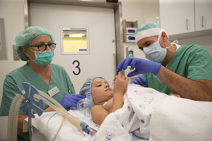 Dr. Wermelt und seinem Anästhesie-Team ist es daher wichtig, dass Eltern ihre Ängste offen ansprechen. In den Vorgesprächen sind die häufigsten Fragen von Eltern, ob die verwendeten Medikamente schädlich sind, ob ihr Kind Schmerzen haben wird, welche Risiken bestehen und wie lange sie von ihrem Kind getrennt sein werden. „Gerade bei Operationen im Säuglingsalter werden Mütter oft zum ersten Mal von ihrem Kind getrennt und tun sich damit besonders schwer. Das ist ein ernst zu nehmender Aspekt.“