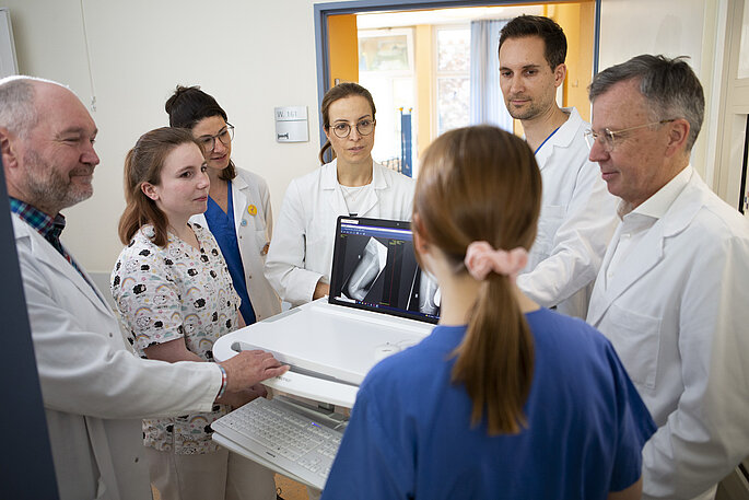 Wenn bei Dr. med. Sabine Grasshoff-Derr das Telefon klingelt, sind es nicht selten die Kolleg:innen aus dem Pränatalzentrum, die soeben Eltern eine beunruhigende Diagnose überbringen mussten. Sie bitten die Chefärztin der Klinik für Neugeborenen-, Kinderchirurgie und -urologie, dazuzukommen und sich mittels Ultraschall ein eigenes Bild zu verschaffen. Denn wenn feststeht, dass ein ungeborenes Kind eine auffällige Entwicklung zeigt, braucht es eine frühzeitige Beurteilung verschiedener Spezialisten.
