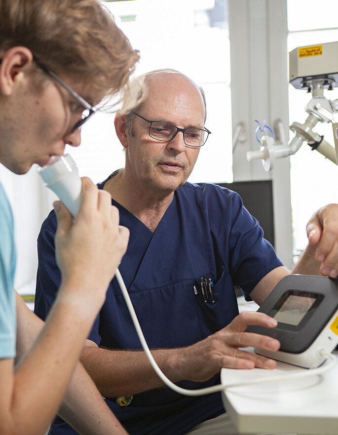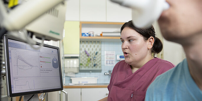 Der erste Schritt in der Diagnose ist immer die Lungenfunktionsdiagnostik. Im Lungenfunktionslabor messen wir die mechanische Fähigkeit der Lungendehnung und die Fließeigenschaften des Atemgases. Zur Beurteilung gibt es alters- und größenadaptierte gesunde Vergleichskontrollen. Wenn die Lunge nicht sehr dehnbar ist, dann ist das immer ein Hinweis darauf, dass Sauerstoff nicht so rasch ins Blut aufgenommen werden kann. Dann messen wir ergänzend die Diffusionskapazität der Lunge: Kann Sauerstoff rasch ins Blut aufgenommen werden oder wird er daran vom Lungengewebe gehindert? Oder man lässt bestimmte Gase inhalieren und misst die Verteilung der Gase in der Lunge. Damit bekommt man heraus, ob die ganze Lunge belüftet wird oder einige Bereich gar nicht erreicht werden. Wir testen die Lungenfunktion auch unter körperlicher Belastung. Dies gibt häufig das Beschwerdebild der Patienten am besten wieder. Mit den Kollegen der Radiologie besprechen wir dann ergänzende bildgebende Verfahren, wie das konventionelle Röntgen der Lunge oder den Einsatz der Computertomographie mit speziellen Untersuchungsprogrammen zur Beurteilung des filigranen Lungengerüsts. Je nach Verdacht werden auch genetische Untersuchungen durchgeführt und manchmal ist auch eine endoskopische Untersuchung notwendig.