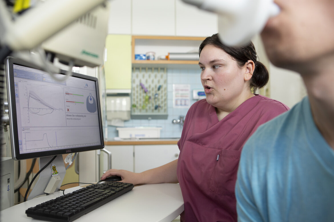 Der erste Schritt in der Diagnose ist immer die Lungenfunktions-diagnostik. Im Lungenfunktionslabor messen wir die mechanische Fähigkeit der Lungendehnung und die Fließeigenschaften des Atemgases. Zur Beurteilung gibt es alters- und größenadaptierte gesunde Vergleichskontrollen. Wenn die Lunge nicht sehr dehnbar ist, dann ist das immer ein Hinweis darauf, dass Sauerstoff nicht so rasch ins Blut aufgenommen werden kann. Dann messen wir ergänzend die Diffusionskapazität der Lunge: Kann Sauerstoff rasch ins Blut aufgenommen werden oder wird er daran vom Lungengewebe gehindert? Oder man lässt bestimmte Gase inhalieren und misst die Verteilung der Gase in der Lunge. Damit bekommt man heraus, ob die ganze Lunge belüftet wird oder einige Bereich gar nicht erreicht werden. Wir testen die Lungenfunktion auch unter körperlicher Belastung. Dies gibt häufig das Beschwerdebild der Patienten am besten wieder. Mit den Kollegen der Radiologie besprechen wir dann ergänzende bildgebende Verfahren, wie das konventionelle Röntgen der Lunge oder den Einsatz der Computertomographie mit speziellen Untersuchungsprogrammen zur Beurteilung des filigranen Lungengerüsts. Je nach Verdacht werden auch genetische Untersuchungen durchgeführt und manchmal ist auch eine endoskopische Untersuchung notwendig.