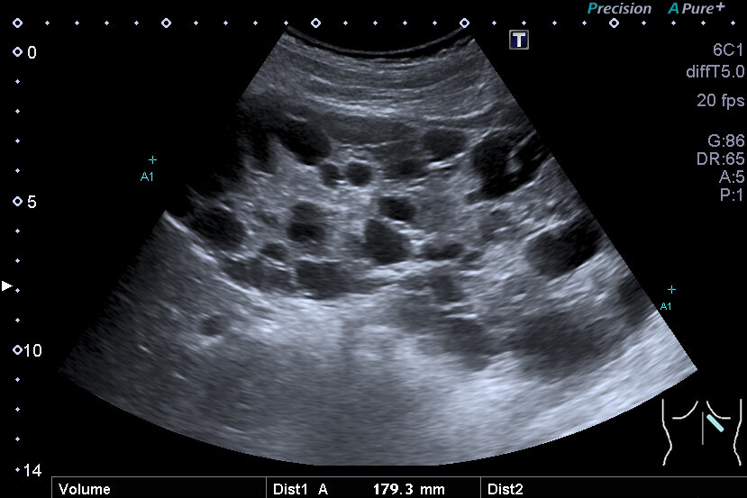 Sehr große, zystisch umgebaute Niere bei autosomal dominant vererbter polyzystischer Nierenerkrankung mit Hypertonie bei einem Jugendlichen. (Foto: Roselieb)