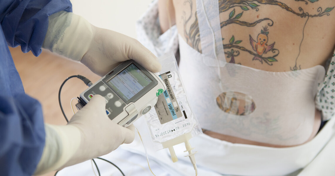 Schließlich wird die Pumpe angeschlossen. Während der Geburt können dann je nach Bedarf Schmerzmedikamente in festgelegten Zeitabständen oder zusätzlich als geringe Einzeldosis von der Patientin selbst durch Knopfdruck über die Pumpe gegeben werden.