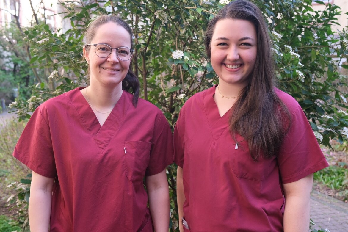 Ihre Kollegin Lea Fluhrer fand dagegen schon als Jugendliche schwangere Frauen faszinierend und sah ihre erste Geburt während eines freiwilligen Praktikums. Für die Ausbildung am Bürgerhospital zog sie von Wertheim nach Frankfurt, seit September 2021 ist sie ausgebildete Hebamme. Schritt für Schritt wurde sie in der Ausbildung an die verantwortungsvollen Aufgaben herangeführt: „Im ersten Ausbildungsjahr habe ich die Leopold-Handgriffe gelernt, mit denen man die Lage des Kindes ertasten kann. Ich habe Wehenschreiber, d.h. CTGs, angelegt und durfte bei den Geburten zuschauen.“